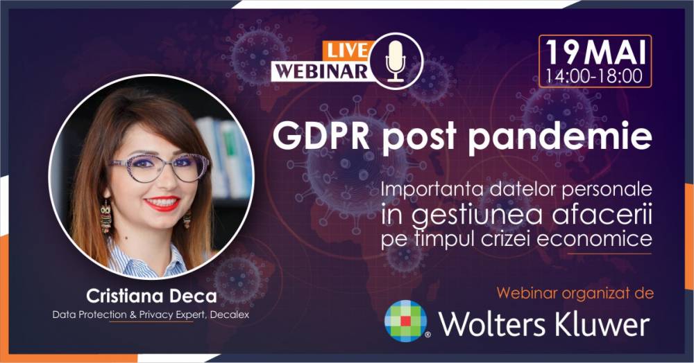 Scopul acestui webinar este de a ajuta companiile să creeze o strategie internă care trebuie urmată de angajator după încetarea stării de urgență, cu privire la datele personale colectate și prelucrate pentru continuarea activității în noua realitate generată de criza economică.